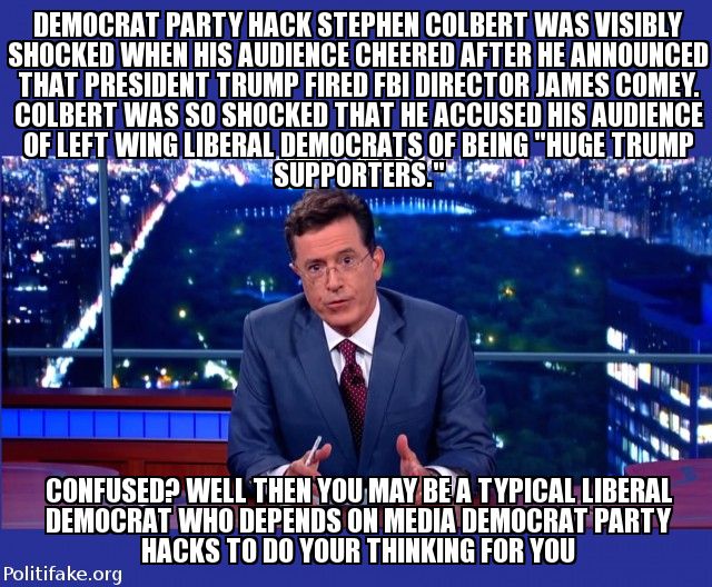 Stephen Colbert, of cock holster fame, was shocked when his liberal infested audience cheered upon hearing that President Trump has fired FBI Director, James Comey. Apparently the foul-mouthed comedian had thought his sheepish followers would bust out in tears. It seems that those who fill the seats of the CBS Late Show cannot really think for themselves. In effect, mindless zombies that must be lead by the nose like some worn-out bull headed thru the slaughterhouse door. Colbert should be aware that he is the foul mouth piece of the liberal left and his followers must be told what to think.